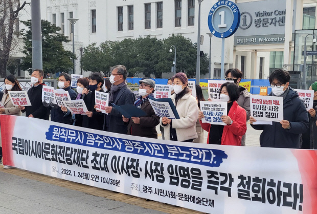 시민사회·문화계 관계자는 2일 “이번 인사 파행은 문화전당이 통합된 조직으로 새롭게 출범하는 시점에서 불거졌다는 데 문제의 심각성이 있다”며 “지역과의 소통 부재 등 문화전당과 전당재단의 활성화를 바라는 지역사회의 염원을 철저히 무시하는 행태”라고 말했다. 이어 “선임 과정을 투명하게 밝힐 것을 지역사회가 한 목소리로 요구하고 있는데 문체부는 광주시, 문화계의 의견을 수렴해 발표했다는 말만 되풀이 하고 있다”며 “어떤 인사가 추천을 했고 어떠한 과정을 거쳐 최종 임명에 이르게 됐는지 소상히 밝혀야 한다”고 덧붙였다.
