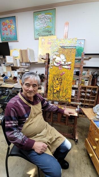 노의웅 화백의 작업실에 놓인 이젤 위에는 전시회에 내 보낼 마지막 작품이 놓여 있었다. 노 화백은 트레이드마크인 ‘구름천사’ 시리즈에 막 사인을 한 참이었다. 동심 가득한 구름을 의인화한 천사들의 모습에, 2022년 임인년을 상징하는 호랑이가 함께 자리한 작품은 율동감 넘치는 노란색 바탕과 어우러져 인상적이다.