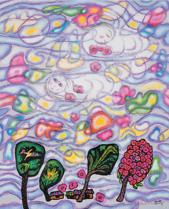그의 대표작 ‘구름천사’는 어릴 적 추억에서 길어올린 소재다. 풀밭에 누워 파란 하늘 위에 그림을 그려보기 시작할 때, 송이 송이 구름은 동물같기도, 천사같기도, 꽃같기도 했다. 60여년의 화업 중 30년 정도 ‘구름천사’를 그리다 보니, 그의 이름 대신 ‘구름천사 작가’라고 부르는 이들을 만날 때면 기분이 좋아진다.