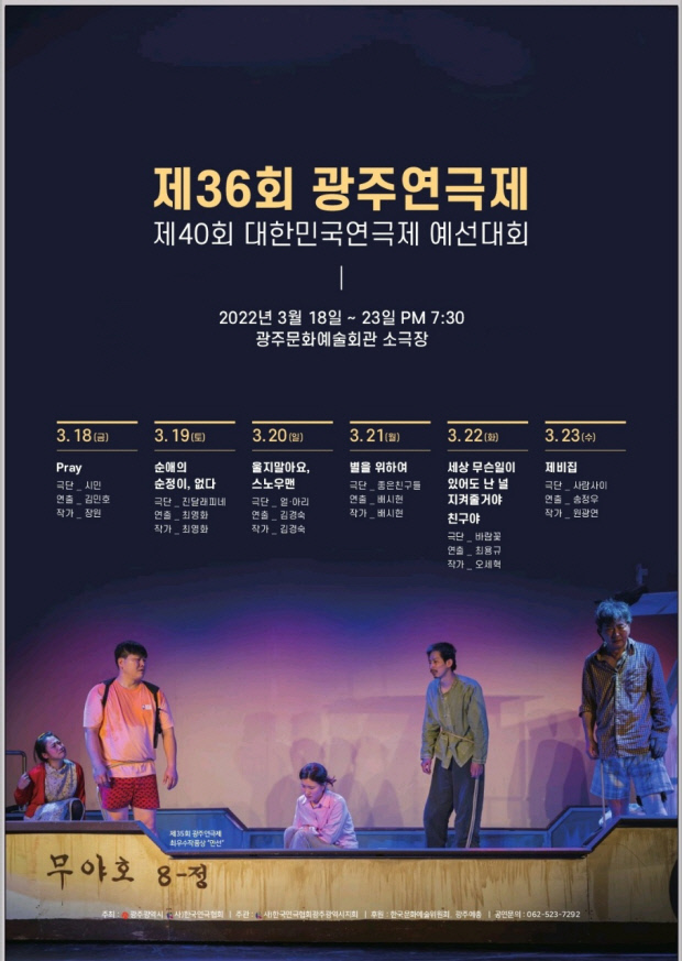지역 극단들이 다양한 작품으로 경연을 벌이는 제36회 광주연극제가 오는 18일부터 23일까지 광주문화예술회관 소극장에서 열린다.