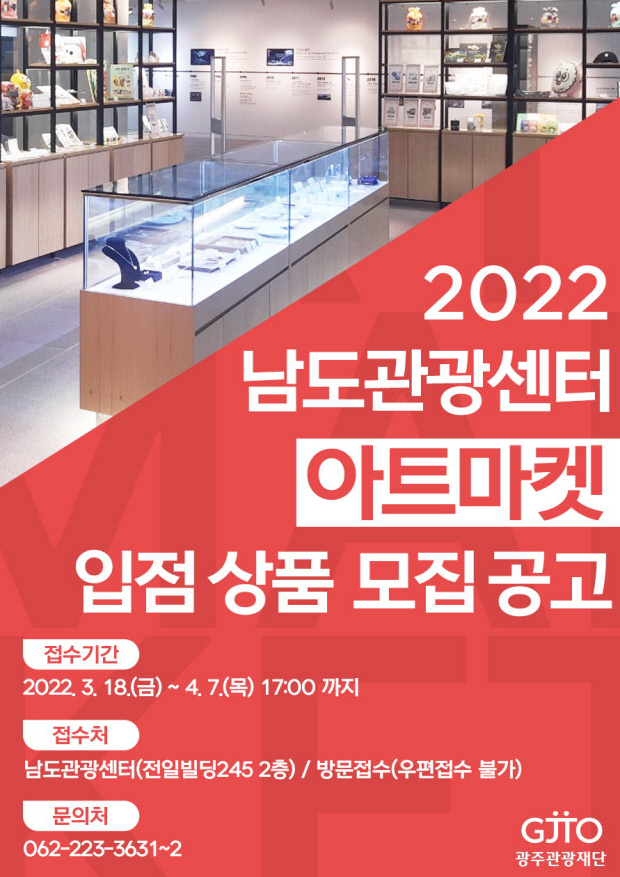 광주관광재단은 ‘2022년도 남도관광센터 아트마켓’ 신규 입점 상품을 공개 모집한다.