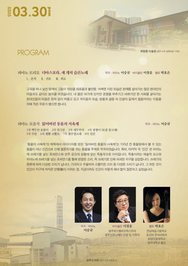 ‘작곡가 이승규와 함께 하는 예술여행’이라는 부제로 열리는 이번 공연은 작곡가이자 피아니스트로 활동중인 이승규씨가 광주 명소를 주제로 직접 만든 곡을 들려주는 시간으로 양림동, 상무소각장, 하정웅 미술관, 사직공원, 용아생가에 대한 음악과 해설이 함께한다.
