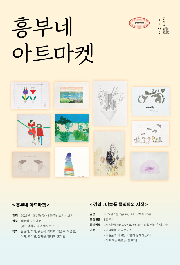 갤러리 포도나무(광주시 남구 백서로 79-1)가 개성있는 작가들의 작품을 구입할 수 있는 ‘흥부네 아트마켓’을 오는 4월1일부터 3일까지 개최한다.