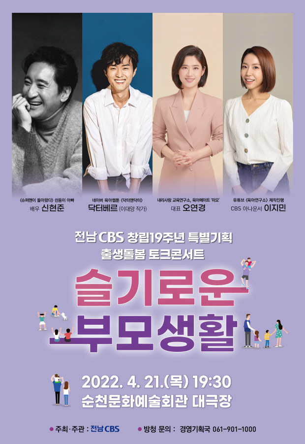오는 21일 오후 7시 30분, 순천문화예술회관 대극장에서 열리는 이번 강연 주제는 ‘슬기로운 부모생활’. 이번 콘서트는 CBS가 지난해 출산돌봄국민운동캠프를 발족하는 등 출산율을 높이기 위해 전개하는 ‘Happy Birth K’ 캠페인 일환으로 마련됐다.