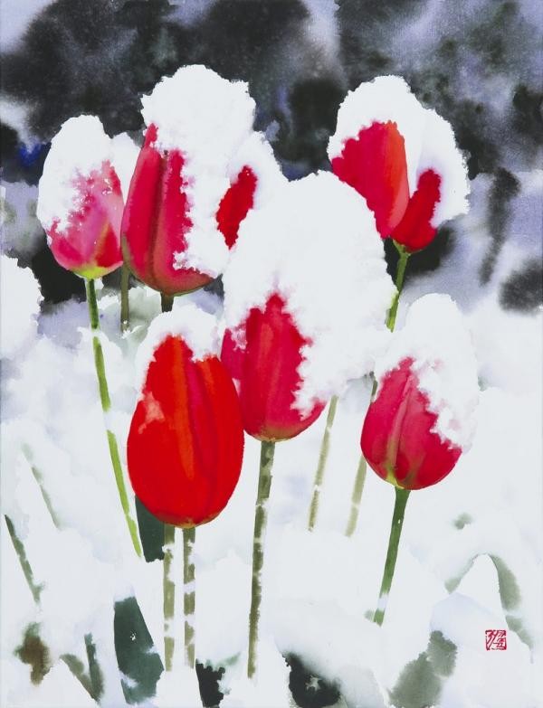 눈과 어우러진 동백과 난초를 수채화로 담백하게 그려낸 작품은 서 작가의 트레이드 마크다. 이번 전시에서는 붉은 튤립과 눈이 함께 한 ‘아름다우면서고 강인한’ 시리즈 등 은은한 수채화 작품도 함께 만날 수 있다.