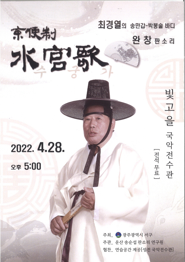 최경열 소리꾼이 들려줄 동편제 수궁가는 송만갑-박봉술-송순섭으로 이어지는 정통 동편제로, 최경열은 동편제의 특징인 호탕한 소릿길과 툭툭 던져내는 성음을 잘 간직하고 표현하는 것이 인상적이다. 고수는 송재익, 박명언 명고가 맡는다.