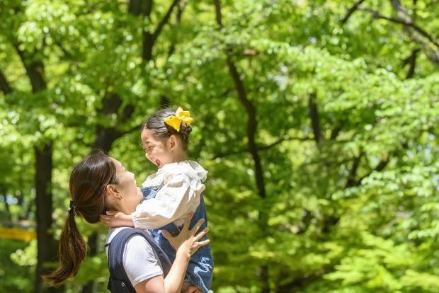 5월의 시작이자 휴일인 지난 1일 오전 광주 남구 사직공원 산책로에서 엄마와 아이가 마스크를 벗고 활짝 웃으며 얼굴을 마주하고 있다. /김진수 기자 jeans@kwangju.co.kr