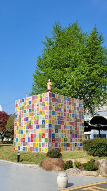 국내 제1호 그림책 전문도서관인 순천시립그림책도서관 마당에 들어서면 대형 설치 작품이 눈에 들어온다. 강익중 작가의‘바람으로 섞이고 땅으로 이어지고’로 다양한 한글이 씌여진 수백개의 알록달록한 블럭을 쌓아올린듯한 사각형 조형물 위에 책가방을 메고 서 있는 아이가 인상적인 작품이다.