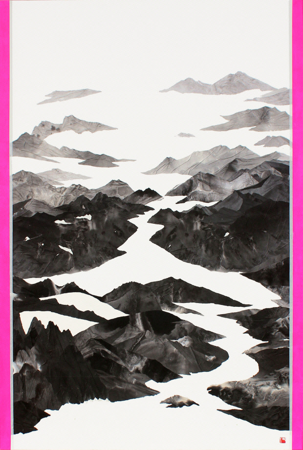 먹의 농담을 살린, 거칠게 오린 화선지 조각을 이어 붙이며 차곡차곡 자연의 산세를 쌓아간 작품은 거대한 산의 형상이 갖고 있는 압도적 느낌을 잘 전달한다.