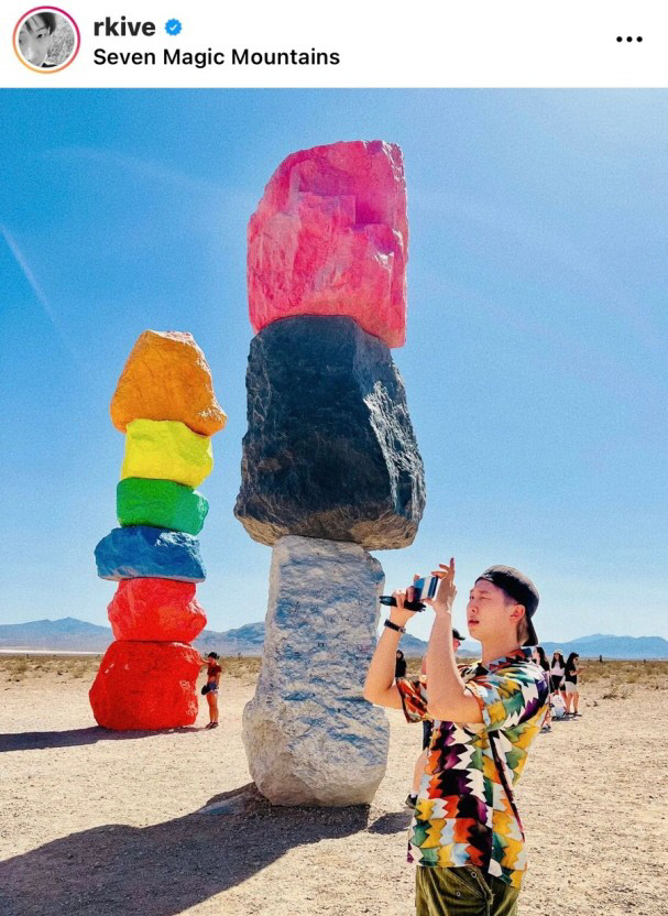사진 속 RM은 형형색색의 거대한 돌 조각을 배경으로 자세를 취한 모습이다.