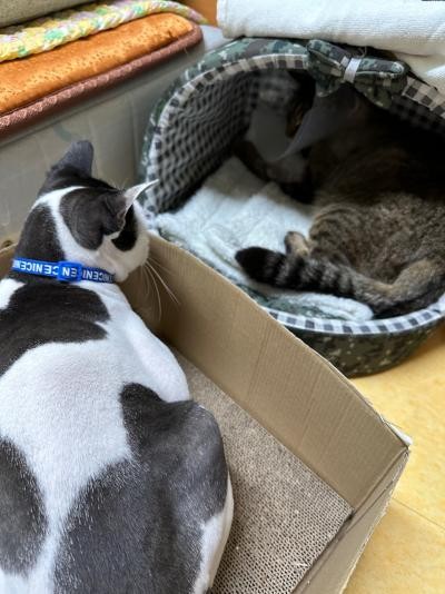 | 고양이 팡이와 함께있는 줄냥이. <김미소씨 제공> |