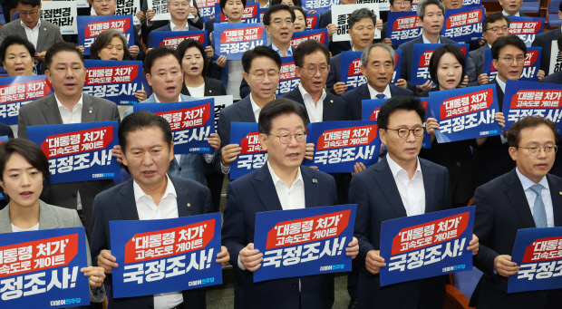 더불어민주당 이재명 대표와 의원들이 13일 오전 서울 여의도 국회에서 열린 정책의원총회에서 ‘대통령 처가’ 고속도로게이트 국정조사 촉구 피켓을 들고 구호를 외치고 있다. /연합뉴스