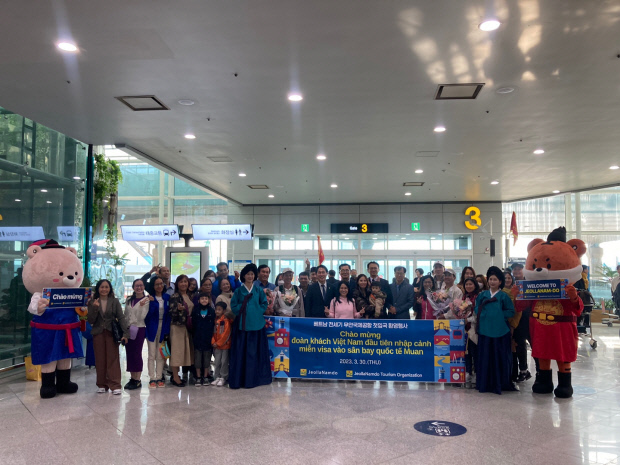 전남을 찾은 동남아 관광객들이 1인당 95만원을 소비한 것으로 조사됐다. 사진은 지난 3월 무안국제공항 국제선 입국장에서 열린 베트남 나트랑-무안국제공항 전세기 첫 입국 환영 행사.