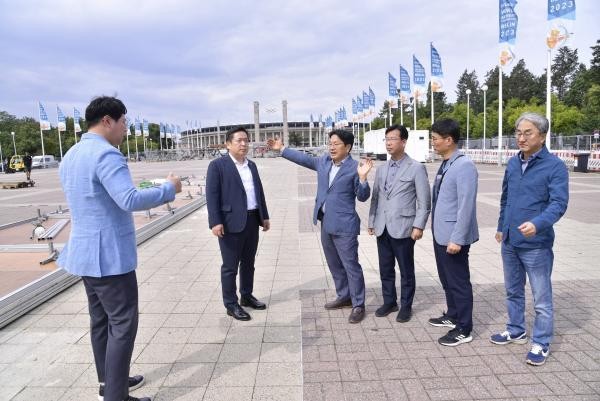 2025 세계양궁선수권대회 개최도시 대표자 자격으로 유럽 출장 중인 강기정 광주시장을 비롯, 김병내 남구청장, 박병규 광산구청장 등 광주시대표단이 27일(현지시간) 2023 베를린세계선수권대회를 앞두고 시설물 설치가 한창인 베를린올림픽플레이스를 둘러보고 있다. <광주시 제공>