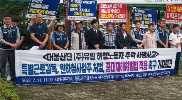 민주노총 금속노조 광주전남지부와 영암군지부는 11일 오전 고용노동부 목포고용노동지청 앞에서 기자회견을 열고 대불산단 내 노동자 추락 사망사고 관련 중대재해처벌법 적용 등을 촉구했다. <민주노총 금속노조 광주전남지부 제공>