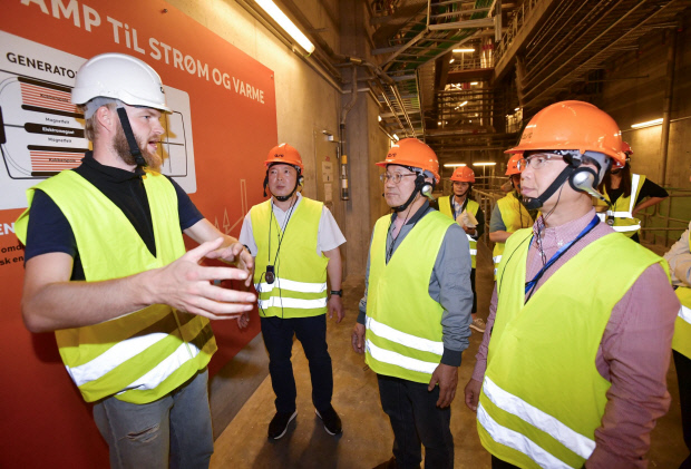 강기정(오른쪽 두번째) 광주시장 등 광주시대표단이 지난 31일(현지시간) 오후 덴마크 코펜하겐 도심에 위치한 소각장 ‘아마게르 바케’를 방문해 내부시설을 살펴보고 있다. <광주시 제공>