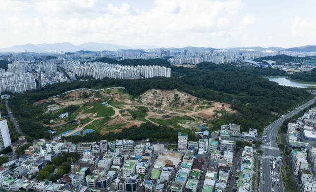 9일 중앙공원 1지구 민간사업자인 빛고을중앙공원개발㈜이 광주시 서구 풍암동 사업지에서 공원정비 공사 등을 하고 있다. 사업자는 오는 2027년까지 2조 1000억원을 투입해 8개 기능을 갖춘 테마숲과 2772세대 규모의 아파트를 짓는다. /최현배 기자 choi@kwangju.co.kr
