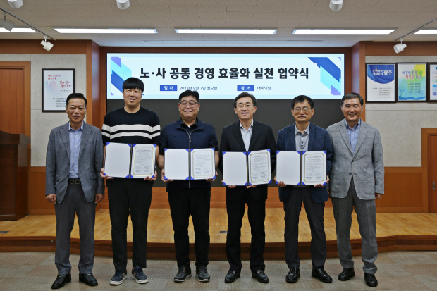 광주시 산하 공기업인 광주환경공단 노사가 지난 7일 공단 대회의실에서 노사 공동 경영효율화 실천 협약식을 체결하고 있다. 사진 왼쪽부터 광주환경공단 최향동 관리본부장, 조성열 노동이사, 김정현 노조위원장, 김성환 이사장, 송현석 노동이사, 박준섭 시설본부장.
