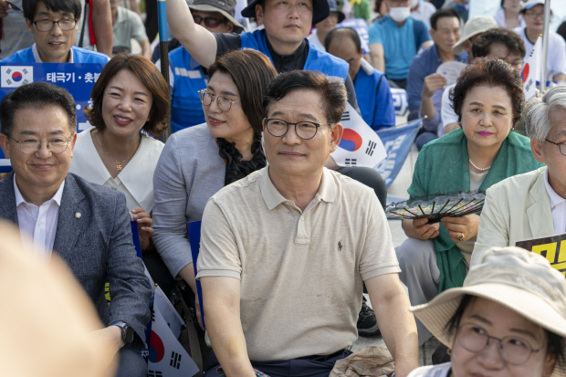 15일 오후 광주 금남로 옛 전남도청 앞 광장에서 열린 ‘제7차 진보중도보수연대 범국민대회’에 참석한 송영길 전 더불어민주당 대표와 이용빈 민주당 의원이 연사들의 연설을 듣고 있다. /김진수 기자 jeans@kwangju.co.kr