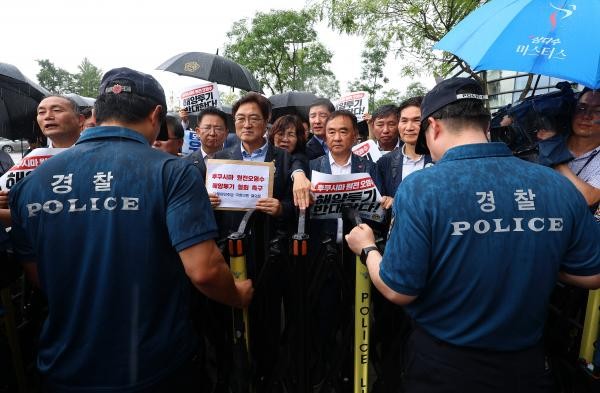 더불어민주당 후쿠시마 원전오염수 해양투기 총괄대책위원 및 소속 의원들이 22일 오후 서울 종로구 일본대사관으로 오염수 해양투기 철회 촉구 결의문을 전달하려다 일본대사관 측의 결의문 수령 거부로 경찰에게 제지당하고 있다. /연합뉴스