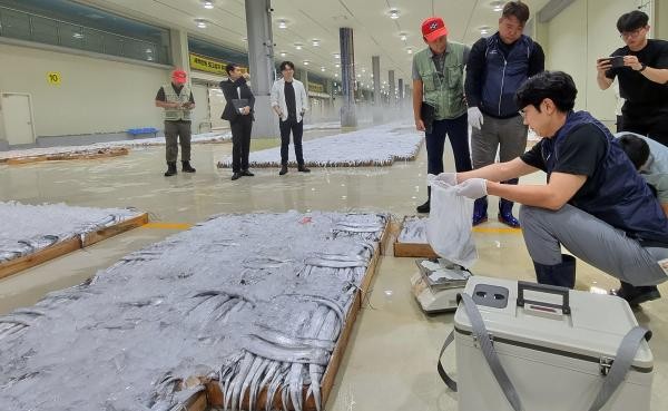 일본 정부의 후쿠시마 원전 오염수 방류를 하루 앞둔 지난 23일 새벽 목포 수협 위판장, 수산물 방사능 검사를 맡은 직원들에 경매에 앞서 갈치에서 방사능 검사용 시료를 채취하는 모습. <광주일보 자료사진>