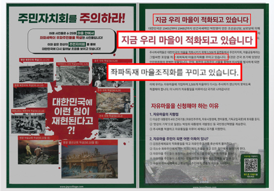 이 의원은 이날 열린 국회예산결산특별위원회 비경제부처별 결산심사에서 “최근 서울 시내 아파트 단지 등지에 ‘주민자치를 주의하라. 우리 마을이 적화되고 있다. 좌파 독재 마을 조직화를 꾸미고 있다’는 문구가 적힌 전단지가 다량 유포되고 있다”고 지적했다.