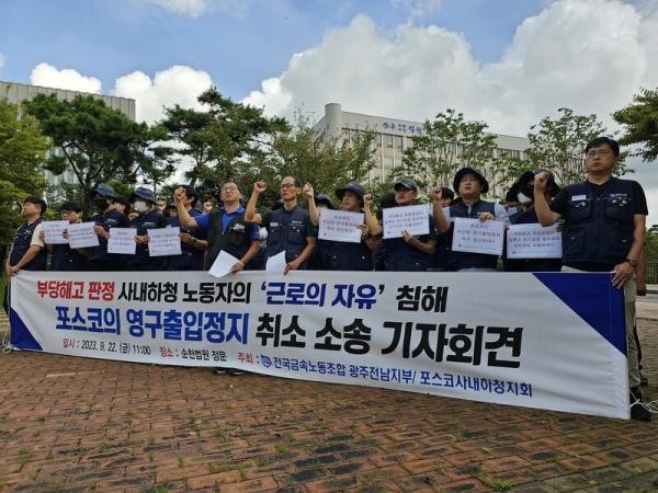 전국금속노동조합 광주전남지부(노조)는 지난 22일 포스코 하청업체 소속 노동자 A(41)씨에 대한 ‘포스코 영구출입정지 취소 소송 기자회견’을 열고 포스코에 소극적·정신적 손해 배상 등을 요구했다고 24일 밝혔다.