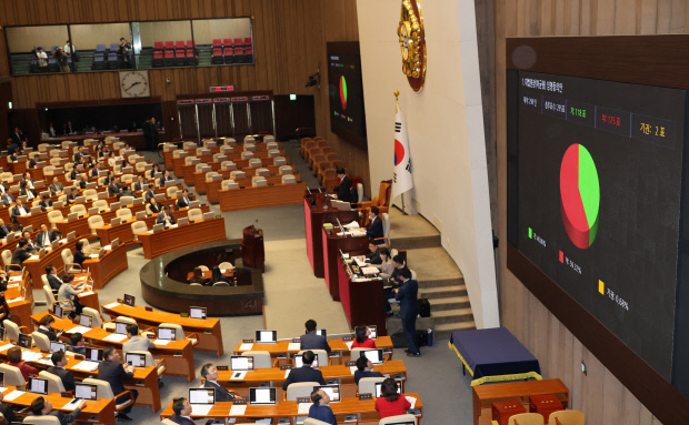 본회의 사회를 본 김영주 국회 부의장이 투표 결과를 알리고 부결을 선포하자, 여야 간 표정은 엇갈렸다.