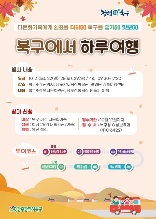 북구는 지역에 거주하고 있는 다문화가족을 대상으로 오는 21일부터 ‘북구에서 하루여행’ 프로그램을 운영한다고 10일 밝혔다.