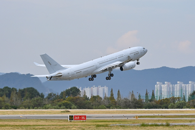 정부가 팔레스타인 무장 정파 하마스의 기습 공격을 받은 이스라엘에 군 수송기를 파견해 한국인 163명을 대피시켰다. 13일 KC-330 군 수송기가 공군 제5공중기동비행단에서 이스라엘 교민 수송 긴급임무 작전을 위해 힘차게 이륙하고 있다.