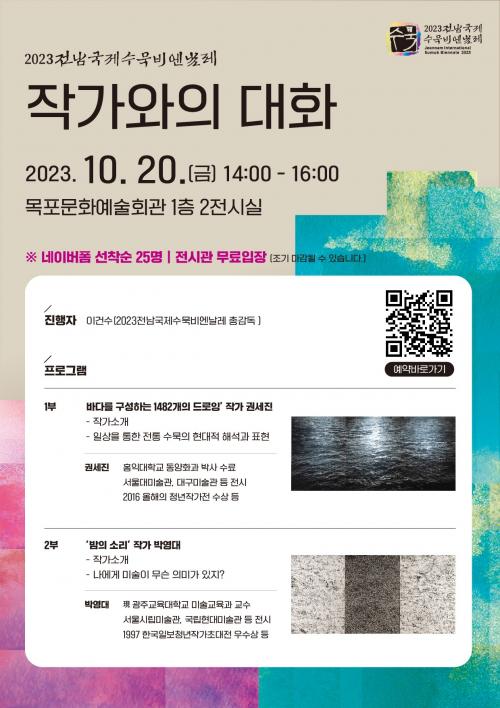 작가와의 대화 사전 예약은 전남국제수묵비엔날레 공식 누리집(http://www.sumukbiennale.kr/) 팝업창 정보무늬(QR코드)로 접속해 신청하면 된다.