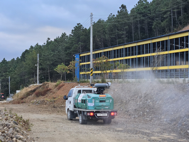 | 해남군이 축산농가 밀집지역에서 방역차량을 이용해 소독을 하고 있다. |