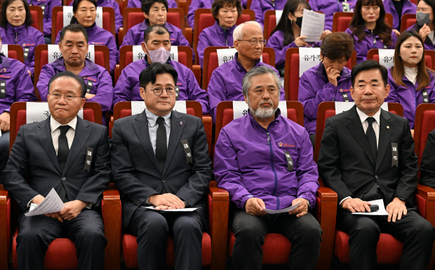 김진표(맨 오른쪽) 국회의장과 국민의힘 윤재옥(왼쪽) 원내대표, 더불어민주당 홍익표(왼쪽 두번째) 원내대표와 이정민 10.29 이태원참사 유가족협의회 운영위원장을 비롯한 참석자들이 30일 오후 국회도서관 대강당에서 열린 10.29 이태원참사 1주기 국회 추모제에 참석해 행사 시작을 기다리고 있다. <사진공동취재단>