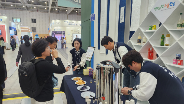 | 전남도 전시관을 찾은 방문객들이 전남의 특산품을 맛보고 있다. |