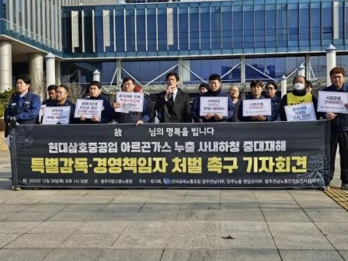 유가족은 전국금속노동조합과 함께 28일 광주지방고용노동청 앞에서 기자회견을 열고 “진상규명과 함께 실효성 있는 처벌과 예방대책이 필요하다”고 주장했다.