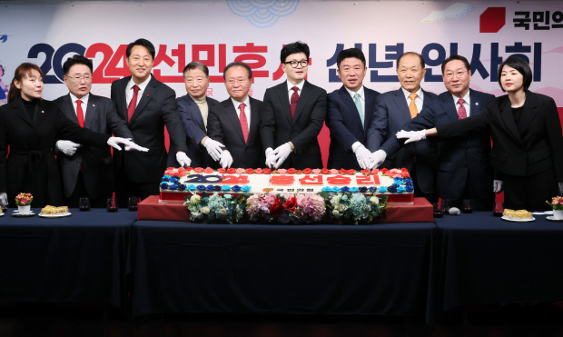 | 국민의힘 한동훈 비상대책위원장과 윤재옥 원내대표 등 참석자들이 1일 서울 여의도 중앙당사에서 열린 신년인사회에서 떡 케이크를 자르고 있다. /연합뉴스 |