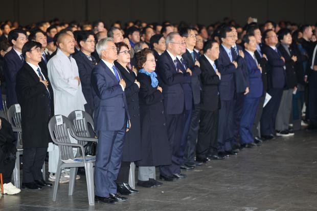 문재인 전 대통령과 김정숙 여사가 6일 경기도 고양시 킨텍스에서 열린 김대중 전 대통령 탄생 100주년 기념식에서 반기문 전 유엔사무총장, 김진표 국회의장, 한덕수 국무총리, 문희상 전 의장 등 참석자들과 함께 국기에 경례하고 있다. /연합뉴스