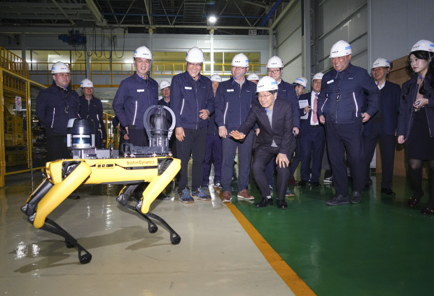 강기정 광주시장이 11일 오전 서구 기아 오토랜드 광주를 방문해 최준영 기아 대표이사와 문재웅 광주공장장 등 임직원들과 만나 지난해 54만여대 생산 달성을 축하한 뒤 ‘셀토스’, ‘쏘울’ 등을 생산하는 1공장을 둘러보며 로봇개 ‘스팟’과 인사를 하고 있다. <광주시 제공>