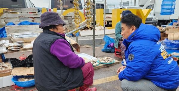 | 박노원 예비후보가 장성 황룡장에서 좌판을 벌인 시장 상인과 대화하고 있다. 〈박노원 후보 페이스북〉 |