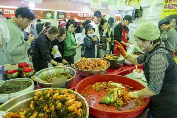 광주시가 미래 신성장 산업으로 김치산업 육성에 나선다. 지난해 서구 상무시민공원 일원에서 열린 제30회 광주김치축제장을 찾은 시민들이 명인 김치를 맛보고 있다. /김진수 기자 jeans@wkwangju.co.kr