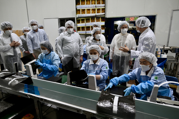 에블린 왕(Evelyn N. Wang) 미국 에너지고등연구계획원(ARPA-E) 원장 등 미국 정부 관계자들과 오운열 해양수산과학기술진흥원(KIMST) 원장, 박병직 본부장 등이 17일 오후 목포의 (주)대상 김 공장을 찾아 한국의 해조류 가공 기술 수준에 대한 설명을 듣고 김 가공 과정을 살펴보고 있다. /김진수 기자 jeans@kwangju.co.kr