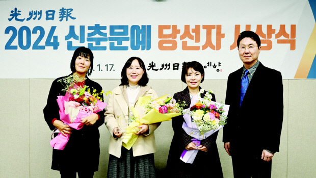 ‘2024 광주일보 신춘문예’ 당선자 시상식이 17일 오후 국립아시아문화전당(ACC) 문화정보원 내 아시아박물관 문화교육실에서 열렸다. 왼쪽부터 단편소설 부문 유재연씨, 시 부문 엄지인씨, 동화 부문 정화영씨, 광주일보 최재호 전무이사·편집총괄국장. /나명주 기자 mjna@kwangju.co.kr