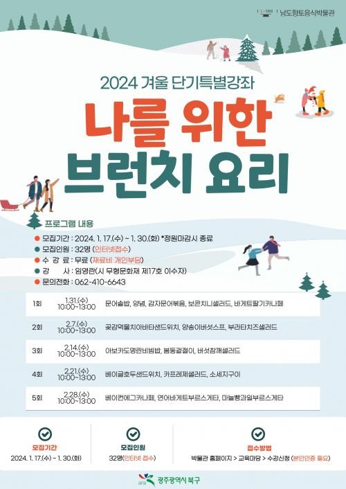북구는 이달 31일부터 2월 28일까지 남도향토음식박물관에서 ‘겨울 단기 특별강좌’를 운영한다고 25일 밝혔다.