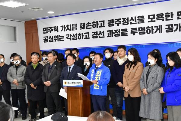 더불어민주당 공천관리위원회의 경선 지역 발표에서 컷오프(공천 배제)된 김성진·최치현 광주 광산을 예비후보가 15일 광주시의회에서 기자회견을 열고 경선 과정을 투명하게 공개할 것을 요구하고 있다.