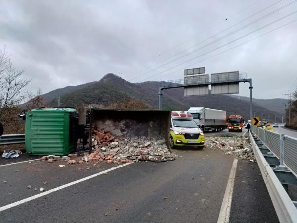 화물차에는 운전자 포함 2명이 타고 있었으나 큰 부상은 입지 않은 것으로 전해졌다. 다만 화물차에 실린 건설 폐기물이 쏟아지면서 1시간 40분간 도로가 통제됐다. 경찰은 정확한 사고 경위를 조사하고 있다.