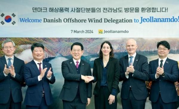 전남도는 7일 도청 왕인실에서 주한덴마크대사관, ㈔전남풍력산업협회와 공동으로 ‘전남도·덴마크 해상풍력 협력 포럼’을 열고 해상풍력 발전 및 산업생태계 구축을 위한 협력 방안을 논의했다. 이들은 포럼 뒤 목포신항과 해남 화원 산단 등을 둘러보면서 풍력산업 성장 가능성도 살폈다.