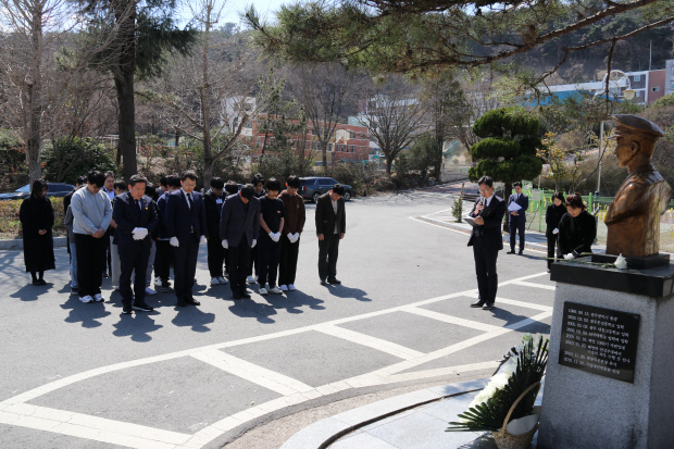 지난 20일 제9회 서해수호의 날(3.22)을 맞아 하성일 광주지방보훈청장, 김병내 광주남구청장, 이기호 문성중학교 교장 등이 문성중학교 내 ‘서정우 하사 흉상’ 앞에서 참배 행사를 진행하고 있다.