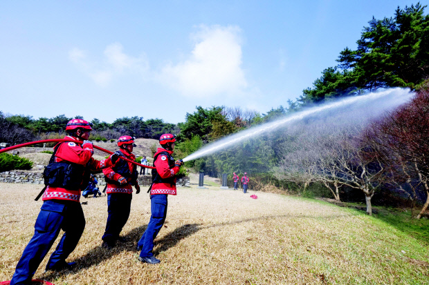 봄철 산불 대응력 강화를 위한 산불진화 합동훈련이 27일 오전 광주시 북구 금곡동 무등산 충장사 일원에서 진행됐다. 이번 훈련은 광주시와 서부지방산림청, 북구청 등 8개 기관이 참여했다. /김진수 기자 jeans@