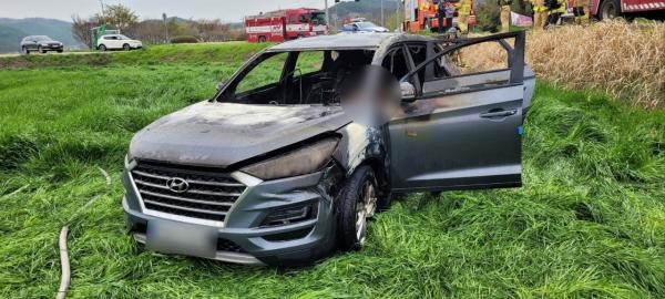 8일 화순경찰에 따르면 이날 오후 2시 40분께 화순군 도암면 용강리에서 농로를 달리던 SUV 차량이 2m 아래 밭으로 추락한 후 불이 났다.