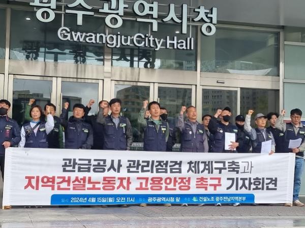 민주노총 전국건설노동조합 광주·전남지역본부(노조)는 15일 광주시청 앞에서 기자회견을 열고 “지역 건설 현장 불법행위를 근절하고 건설노동자 생존권을 보장하라”고 주장했다.
